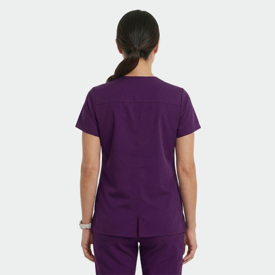 Bluză medicală damă ANGELICA mov prună, cu croială elegantă și material elastic, concepută pentru confort și mobilitate pe tot parcursul zilei.