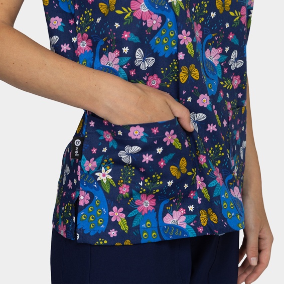 🦚 Bluză medicală BAMBINA Peacock – bluză medicală cu imprimeu vesel și confort elastic