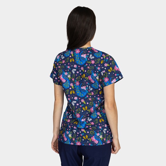 ✔ Bluză medicală cu imprimeu Midnight Peacock – design vesel și modern
